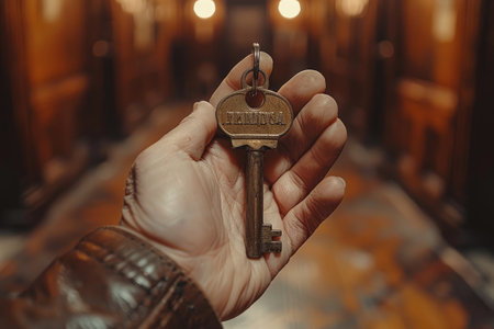 A close-up of a vintage key inserted into an ornate door lock, featuring an elegant, blurred background. The warm lighting creates a luxurious atmosphere.
