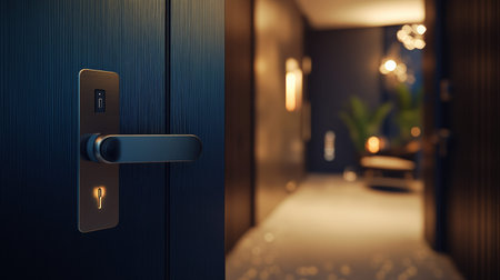 Modern hotel room door slightly open, revealing a cozy and inviting interior with warm lighting and elegant decor, creating a relaxing atmosphere for guests