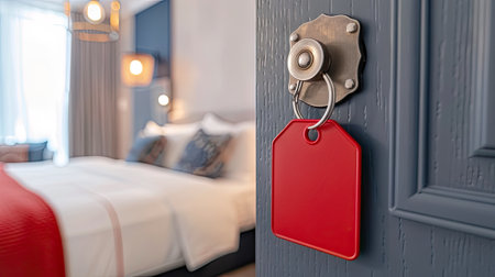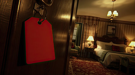 A vibrant red tag hangs on the doorknob of a hotel room, inviting guests to enter and stay in quiet comfort.