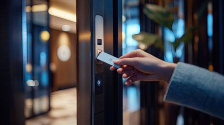 Guest entering a hotel room after tapping an RFID key card on a digital lock panel, showing ease of check-in