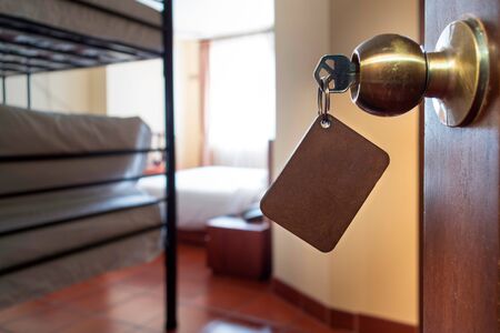 Hotel room or apartment doorway with key and keyring key fob in open door and bedroom in background