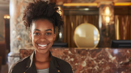 Smiling woman with curly hair stands confidently at hotel reception, showcasing warmth and professionalism in luxurious setting. elegant decor enhances welcoming atmosphere
