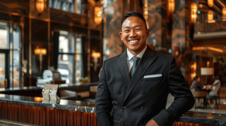 Smiling hotel concierge in stylish suit stands confidently in luxurious hotel lobby, showcasing elegance and professionalism. warm ambiance and modern decor enhance welcoming atmosphere