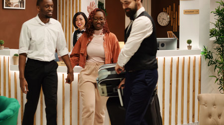 African american guest arriving at hotel, waiting to receive access key and do check in at reception desk. Young adult with luggage preparing to find accommodation, resort lobby.