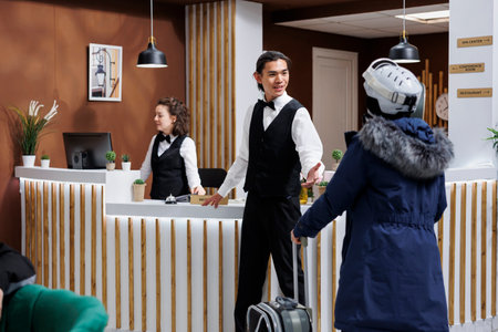 Asian male concierge assists woman in winter clothing with luggage at hotel reception. Female traveler approaches front desk of ski mountain resort with suitcase and receives assistance from employee.