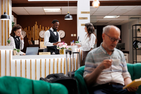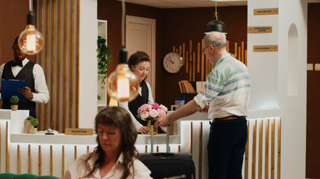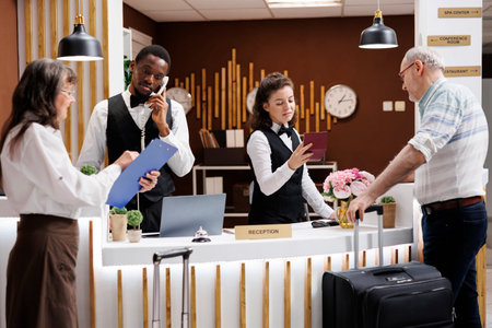 Retired adult at front desk does check in process in luxury hotel lobby. Reception staff assisting traveller with registration to ensure pleasant stay, all inclusive room accommodation.