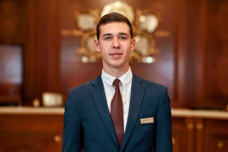 Portrait of a handsome young man in a suit at the hotel reception