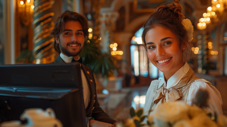 Friendly hotel staff greets guests at the reception with warm smiles in a luxurious lobby setting.