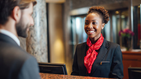 A cheerful hotel receptionist welcomes a guest with a warm smile and helpful attitude during check in.