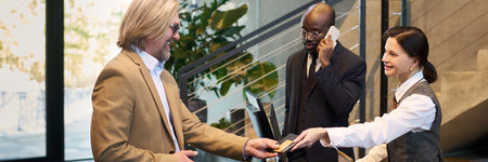 Smiling female receptionist in beige blouse hands keycard to male guests at hotel front desk in modern lobby. Concept of hospitality, customer service, check-in, and business travel experience.