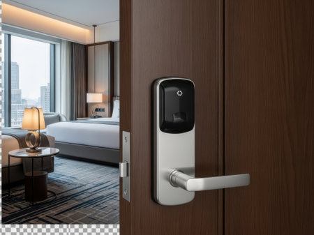 This image showcases a contemporary electronic door lock with a silver handle and black touchscreen, mounted on a wooden door. The lock is set against a white background, highlighting its modern design. In the background, a luxurious hotel room is visible, complete with a large bed, comfortable seating area, and a cityscape view through the window. The image is a composite, with the door and lock on the right side and the hotel room on the left, creating a striking contrast between the secure entrance and the inviting interior.