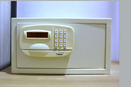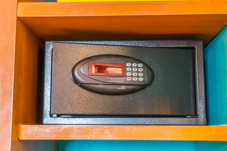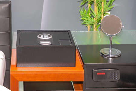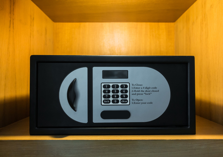 Locked and Closed digital modern Black Safe box, Stroungbox on the shelf in wood Closet in Hotel room