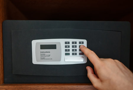 A hand is adjusting the combination dial of a safe, emphasizing security and the importance of protecting personal belongings in a private setting.