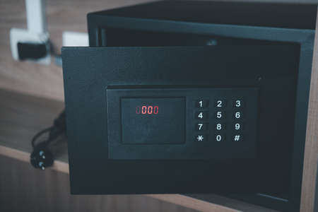 An open empty black safe box or modern electronic locker in hotel room or home.