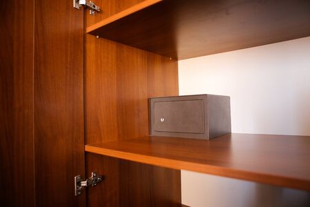 Small metal safe. Safe inside cabinet. Safe with buttons for entering a password. Compact strongbox inside cabinet. It is designed to store valuable items. Concept - purchase of strongbox.