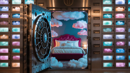 Imposing bank vault door swinging open, revealing luxurious dream bedroom
