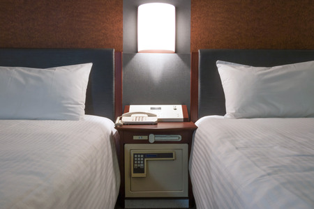 A security system is installed on the wall of the hotel room to ensure safety measures are in place