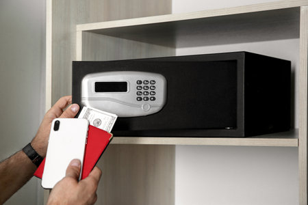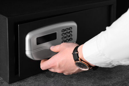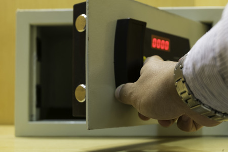 Open safe door with electronic lock close up. Keep money and jewelry at home. man's hand and safe in the apartment