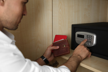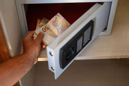 Man opens safe depository of valuables and money in his home. Keep the money in the safe at home. Safe, hand close-up