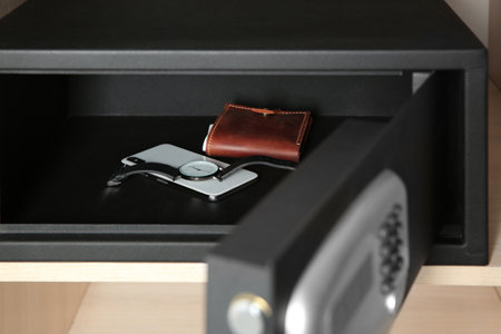 Open steel safe with wallet, watch and smartphone in wooden closet at hotel
