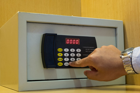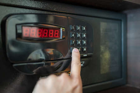 Finger are pressing the number keys of electric safe to unlock the safety code