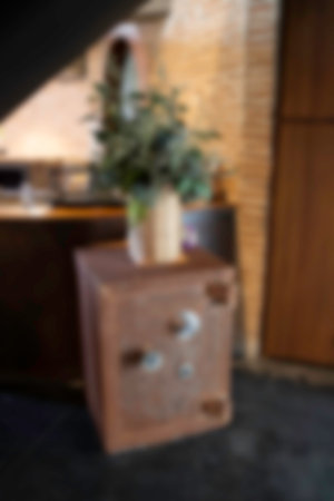 Small modern safe on shelf in dark. Small safe box close up in low key light. Selective focus