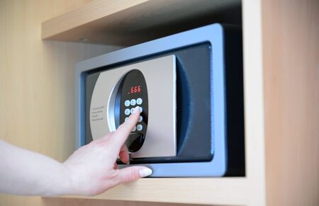Woman hand opens a safe hidden in the wardrobe at the hotel.