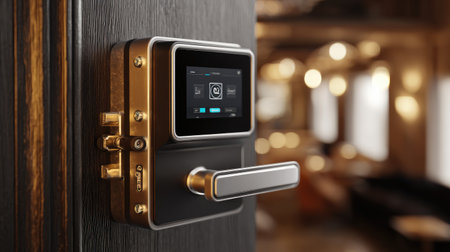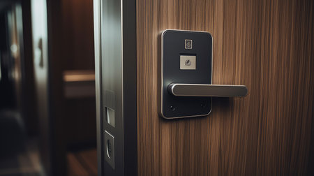 Wood door with smart lock, touch screen keypad and fingerprint, key less access Generative AI
