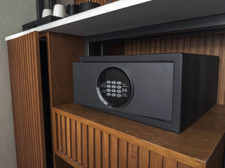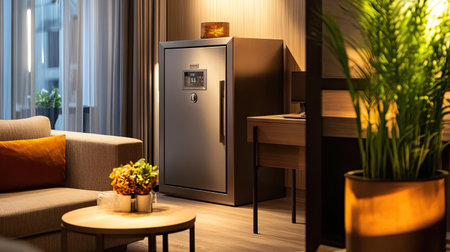 A metal safe in a hotel room, discreetly integrated into the furniture design for secure and convenient use