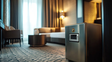 A sleek, compact metal safe in a hotel room, highlighted against a clean and modern interior design