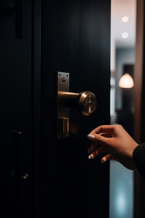 A person's hand opening the door to a brightly lit room in a hotel or home, AI-generated.