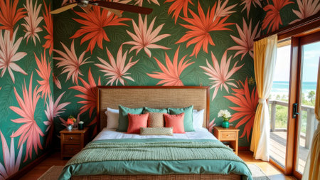 Tropical themed bedroom with floral wallpaper and ocean view. That the image is generated using AI.