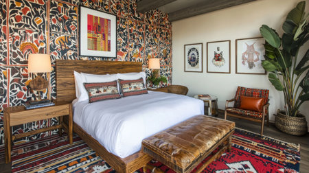 This stylish bedroom features vibrant wallpaper, wooden furniture, and cozy bedding, creating a warm and inviting atmosphere for modern home interiors.
