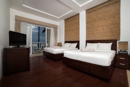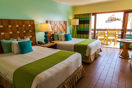 Interior view of hotel room. Big beds, table with armchair and balcony. Tourism concept. Willemstad. Curacao. 17.17.2019.