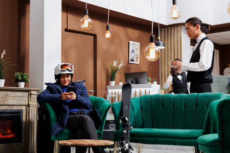 In lounge area, woman in winter jacket is using her smartphone as young server gives her a coffee. Female tourist using a mobile device to plan activities during her skiing trip at a fancy winter resort.