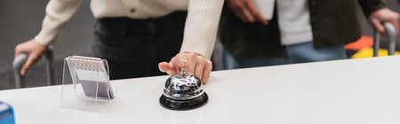 cropped view of woman ringing service bell near card holder on hotel reception, banner