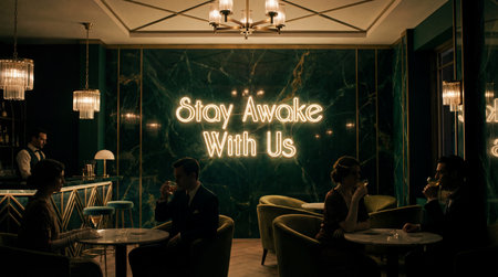 Elegant patrons sit at marble tables in a dimly lit lounge featuring green marble walls and a neon sign reading Stay Awake With Us. Warm light glows from crystal chandeliers.