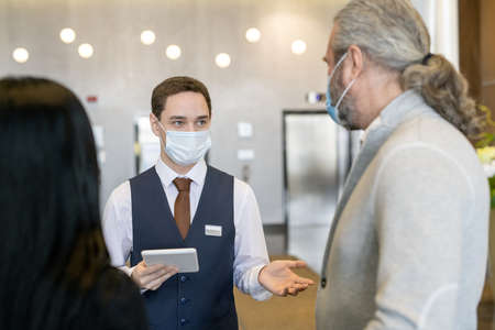 Young male receptionist in protective mask and formalwear using touchpad while talking to mature businessman in the lounge
