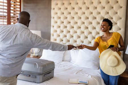 Couple in hotel room exchanging travel documents, smiling and preparing for vacation. tourism, passports, planning, relaxation, accommodation, journey