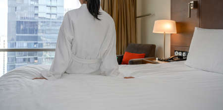Rear view of woman in white bathrobe sitting on bed after waking up, looking at city view in the window. Copy space