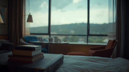 Luxury hotel room interior with books on bed and view on mountains