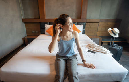 Tourist woman sitting on bed with her luggage in hotel bedroom after check-in. Conceptual of travel and accommodation.