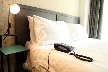 Telephone on bed in hotel room