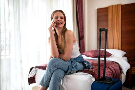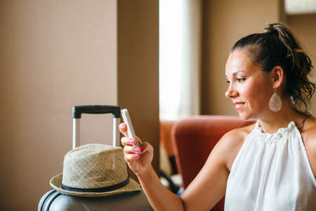 Beautiful brunette girl sitting on the bed leaning on her luggage case