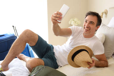 Happy man on vacation taking a selfie with hat on her hand lying on the bed in a hotel room