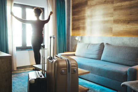 Woman traveler with luggage suitcase after checking Into a Hotel Room looking in the window. Silhouette of visitor in travel accommodation ready to have rest.