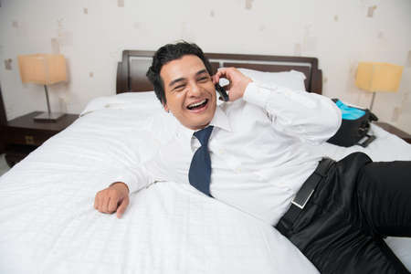 Businessman lying with a mobile in a hotel