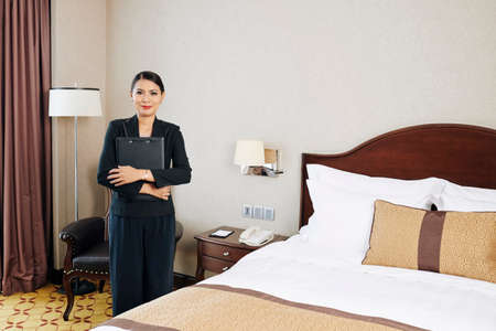 Portrait of Asian young manager in formalwear and with folder in her hands standing in the hotel room and looking at camera