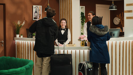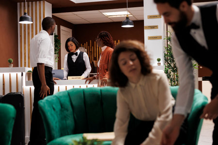 Hotel staff talking to guests in lobby, offering luxury services to people waiting in lounge area. Employee recommending tropical leisure activities to couple with room reservation.
