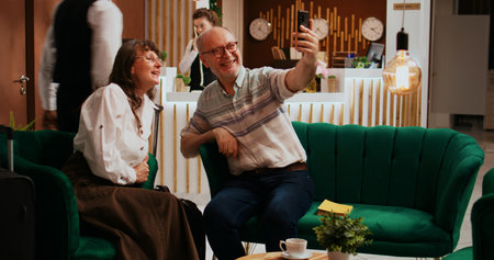 Older guests using videocall connection to keep in touch with family back home, travelling on retirement holiday. Husband and wife talking to children and nephews on teleconference call.